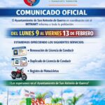 Comunicado Oficial El Ayuntamiento de San Antonio de Guerra en coordinación con el INTRANT informa a toda la población Del lunes 9 Al viernes 13 de Febrero .