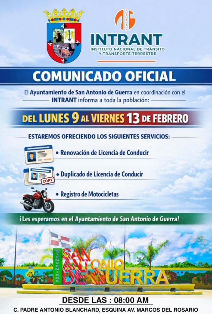 Estaremos ofreciendo los siguiente servicios : Renovación de Licencia de conducir , Duplicado de licencia ,Registro de motocicletas ¡ Les esperamos en el Ayuntamiento de San Antonio de Guerra !