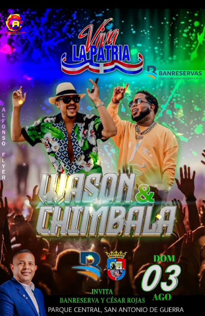 Ven estés Domingo 03 de agosto desde la 7 de la noche al parque centrar de Guerra a cantar y bailar con WASON Y CHIMBALA estamos celebrando con orgullo los 162 aniversario de la restauración .